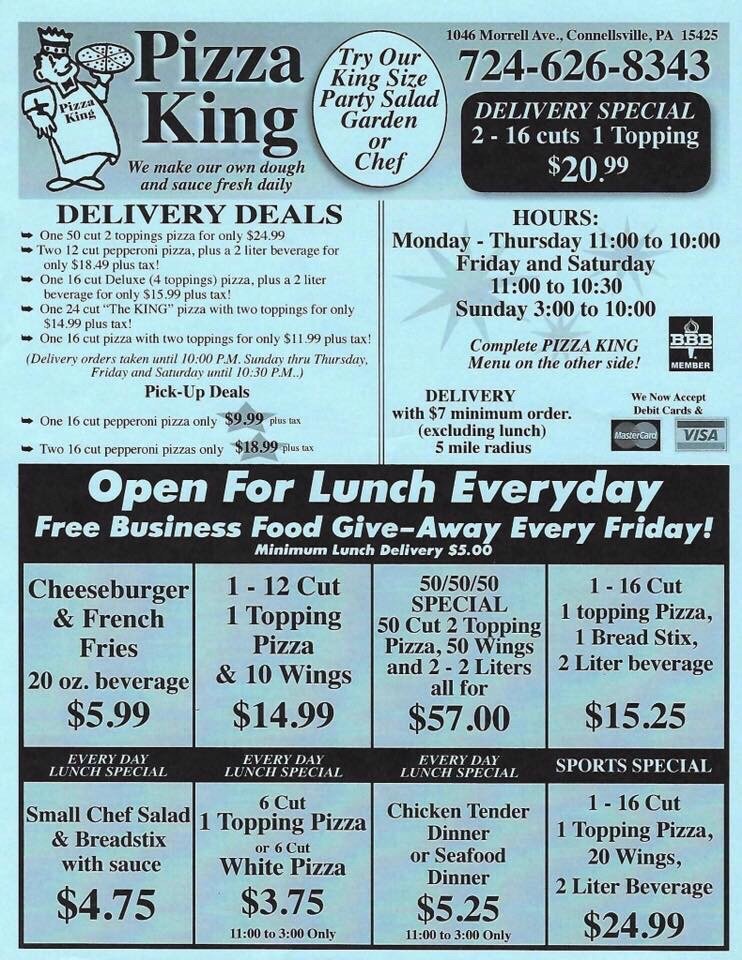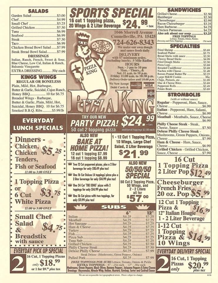 Introducing Pizza King, a hidden gem offering a variety of dishes including soup, pizza, and more. Situated at 1046 Morrell Ave in Connellsville, PA, this restaurant boasts a range of amenities such as delivery, takeout, reservations, and more. Customers rave about the delicious sandwiches, crispy fries, and mouthwatering pizza with fresh homemade dough and sauce. The friendly staff, quick delivery, and affordable prices make Pizza King a top choice for a quick meal or a lazy night in. With a cozy atmosphere and great food, this spot is perfect for groups, families, or even solo dining. Don't miss out on the chance to try their signature items like the chicken bacon ranch sub, deluxe philly, or the sausage pizza. Pizza King truly lives up to its name as a royal destination for satisfying meals.